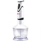 Accessori: mixer immersione, frusta per montare, contenitore con lame in acciaio inox e bicchiere.