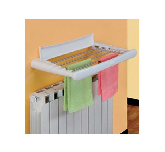 In alluminio e resina. Da parete, versatile e salvaspazio. Fili grossi che evitano le pieghe sui capi asciutti. Richiuso diventa una pratica mensola o portasciugamani. Per pareti esterne ed interne. Dimensioni aperto: Cm. 70x38x6.