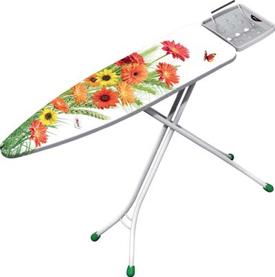In acciaio. Dotata di poggiaferro con archetto di appoggio reversibile, adatto anche per mancini. Struttura gambe a sezione tonda. Copriasse 100% cotone con imbottitura in mollettone. Piano di stiratura Cm. 110×33.