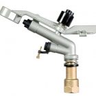 In ottone, lega leggera e rilsan. 1 getto. Per l’irrigazione a pioggia lenta di vigneti, frutteti e ortaggi. Con ugelli intercambiabili e rompigetto regolabile. Attacco con filettatura femmina. Pressione: da 1,5 a 4 bar. Gittata: da Mt. 12 a 17. Portata Lt./Min. da 20 a 60. Superficie irrigata: da Mq. 452 a 907. Inclinazione a 30°.